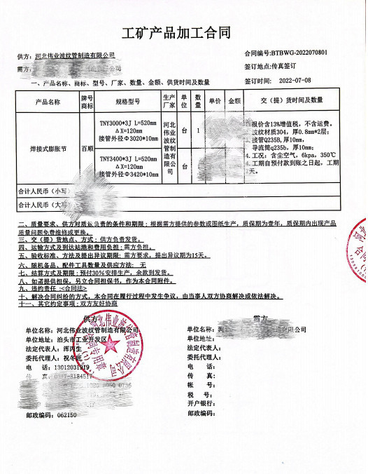 王總來我公司驗廠,并簽訂了2臺水泥廠用補償器。從設計圖紙到安排生產,從加工生產到成品展示,偉業波紋管技術小編一直跟蹤記錄,讓我們一起了解焊接式膨脹節的上岸過程吧!